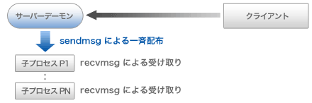 親サーバー・デーモンが sendmsg を発信すると、子プロセス達は一斉に我先にとメッセージを