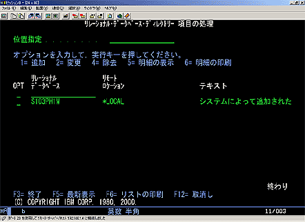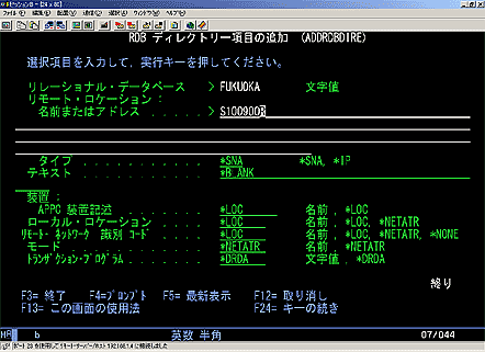次に東京では同じように WRKRDBDIRE + [実行] の「1= 追加」によって福岡のRDB を