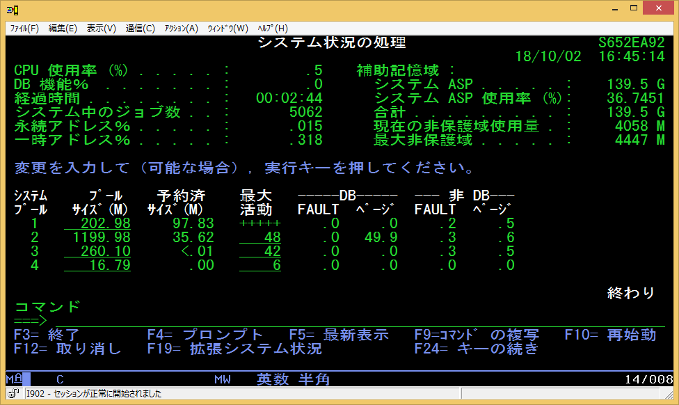 コマンド入力画面で WRKSYSSTS を入力