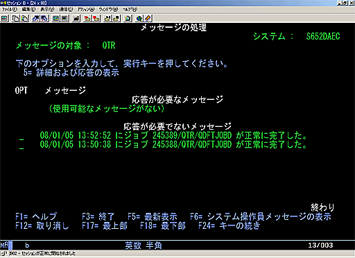 SBMJOB コマンドによってバッチJOB に投入しただけでは完了したのかどうかをDSPMSG で、
