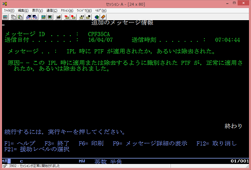 にて操作員メッセージを表示する。 PTFが正しく適用されていれば、