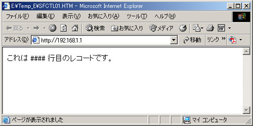 ----------------------------------------------------------------------------------- <HTML> <HEAD></HEAD> <BODY> <REPORT NAME=SFREC01> これは <span name=GYO.0000 alt="4S0" EDTCDE(Z)>####</span> 行目のレコードです。<br> </REPORT> </BODY> </HTML> -----------------------------------------------------------------------------------