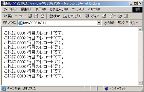 ---------------------------------------------------------------------------------- <HTML> <HEAD></HEAD> <BODY> <REPORT NAME=SFREC01> これは <span name=GYO.0001 alt="4S0" EDTCDE(Z)>0001</span> 行目のレコードです。<br> </REPORT> <REPORT NAME=SFREC01> これは <span name=GYO.0002 alt="4S0" EDTCDE(Z)>0002</span> 行目のレコードです。<br> </REPORT><REPORT NAME=SFREC01> これは <span name=GYO.0003 alt="4S0" EDTCDE(Z)>0003</span> 行目のレコードです。<br> </REPORT><REPORT NAME=SFREC01> これは <span name=GYO.0004 alt="4S0" EDTCDE(Z)>0004</span> 行目のレコードです。<br> </REPORT><REPORT NAME=SFREC01> これは <span name=GYO.0005 alt="4S0" EDTCDE(Z)>0005</span> 行目のレコードです。<br> </REPORT><REPORT NAME=SFREC01> これは <span name=GYO.0006 alt="4S0" EDTCDE(Z)>0006</span> 行目のレコードです。<br> </REPORT><REPORT NAME=SFREC01> これは <span name=GYO.0007 alt="4S0" EDTCDE(Z)>0007</span> 行目のレコードです。<br> </REPORT><REPORT NAME=SFREC01> これは <span name=GYO.0008 alt="4S0" EDTCDE(Z)>0008</span> 行目のレコードです。<br> </REPORT><REPORT NAME=SFREC01> これは <span name=GYO.0009 alt="4S0" EDTCDE(Z)>0009</span> 行目のレコードです。<br> </REPORT><REPORT NAME=SFREC01> これは <span name=GYO.0010 alt="4S0" EDTCDE(Z)>0010</span> 行目のレコードです。<br> </REPORT></BODY> </HTML> ----------------------------------------------------------------------------------