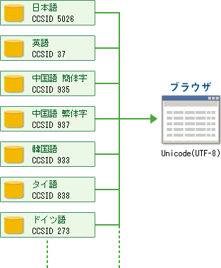左辺にある各国語データ・ベースは Unicode 変換によって右辺にあるブラウザへ