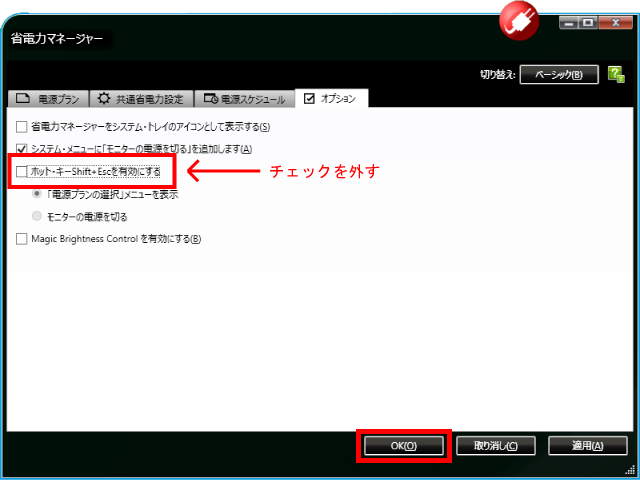 「ホット・キー Shift + ESC 有効にする」のチェックをはずして