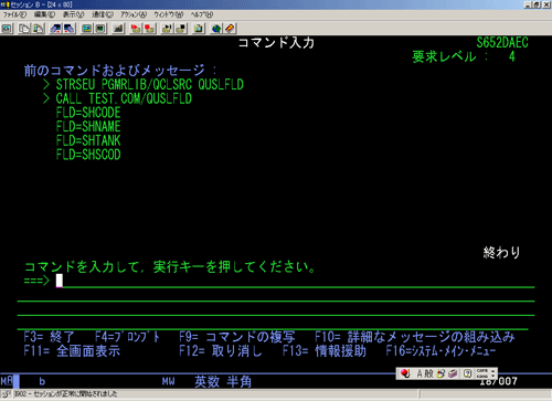 最初に準備としてユーザー・スペース: QTEMP/QUSLFLD を