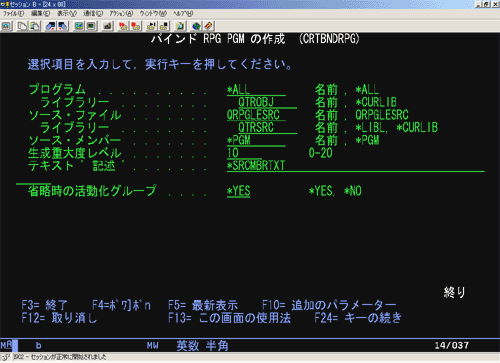 最初に CRTBNDRPG コマンドの実行の画面は次のとおりである。