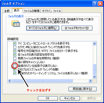 [Windowsエクスプローラ] - [ツール] - [フォルダオプション] - [表示タブ] - - [登録されている拡張子は表示されない] のチェックを外す。