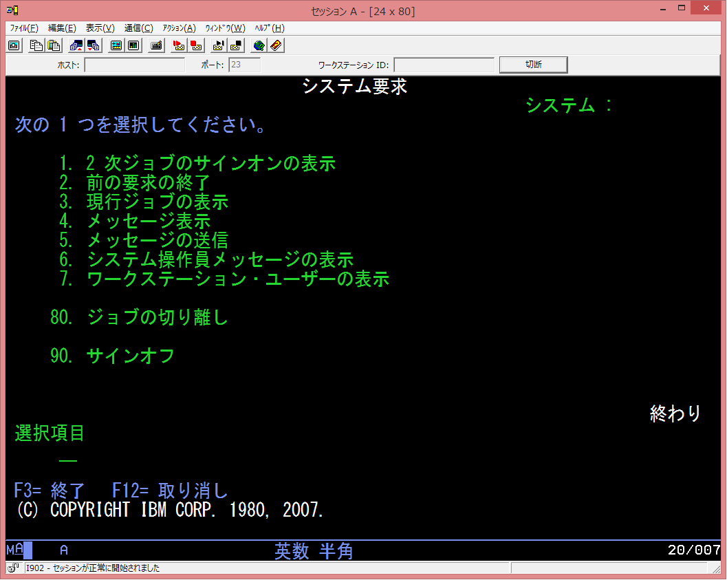 システム要求 システム : 次の一つを選択してください。 1. 2 次ジョブのサインオンの表示 2. 前の要求の終了 3. 現行ジョブの表示 4. メッセージ表示 5. メッセージの送信 6. システム操作員メッセージの表示 7. ワークステーション・ユーザーの表示 80. ジョブの切り離し 90. サインオフ 選択項目