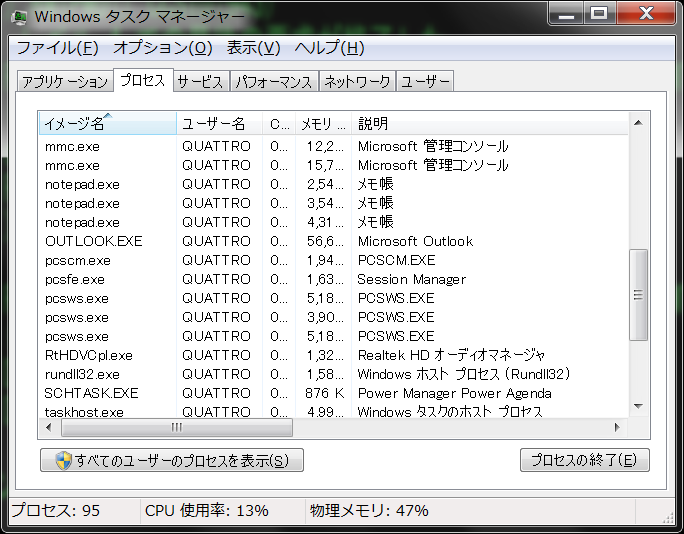 そこで「すべてのユーザーのプロセスを表示」をクリックしてみると