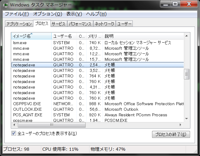 今度はnotepad.exeが起動されていることがタスクマネージャーに現れてきた。