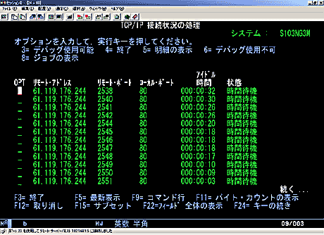 NETSTAT の 3.TCP/IP接続状況の処理 を選択してリモート・アドレスの表示に注目して頂きたい。