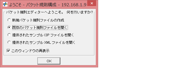 「ようこそ」のダイアログで「既存のパケット規則を開く」を選択してから