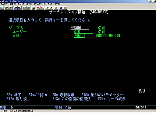 開始のためにはジョブ名、ユーザー名、ジョブ番号が必要となる。