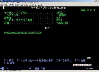 サービス・プログラムを DSPSRVPGM コマンドによって参照すると、次のような画面を