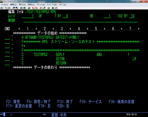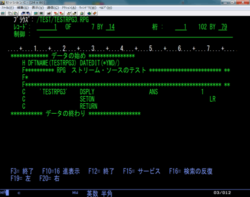 次に WRKLNK '/TEST' によって IFS をオープンしてTESTRPG3.RPG をオープンすると