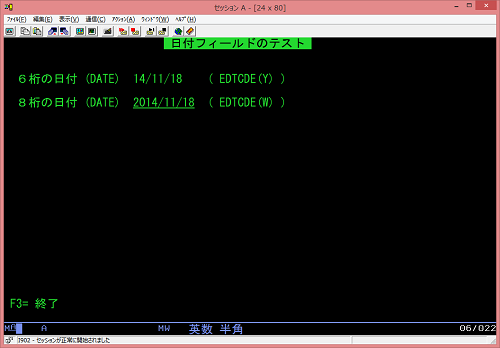 のように DDS で DATE キー・ワードを使うと今日の日付( UDATE ) が画面に表示されることは