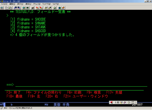 0072.00 printf("** TESTUSLFLD: フィールド一覧表 **\n");