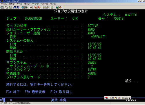 MN00 として仮想ログインしたときの DSPJOB OPTION(*STSA) が実行されいる様子である。