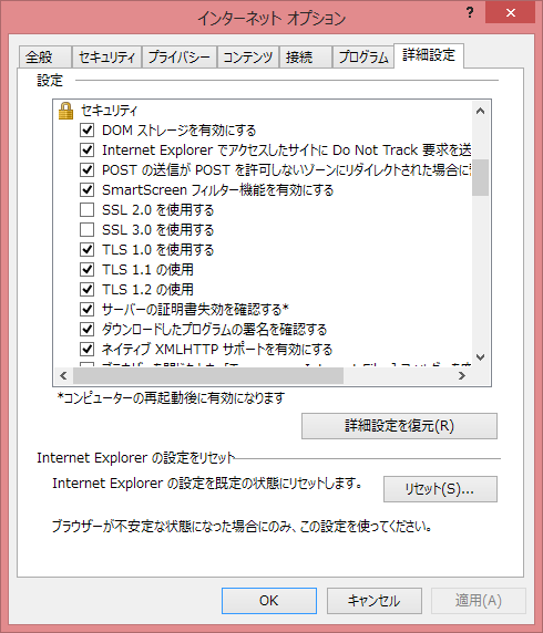 ブラウザのインターネット・オプションで「詳細設定」タブを選択して「セキュリティ」を