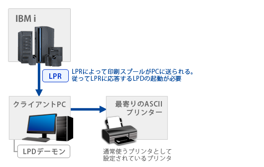 IBM i は 印刷スプールを LPR で送信するためのコマンド LPR が用意されているし、