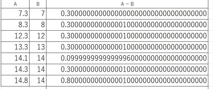Excelのセル計算で 7.3 – 7 = 0.3 であるが