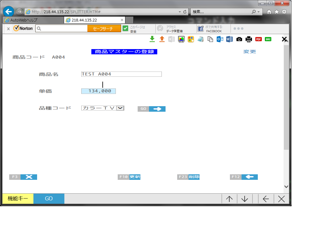 選択行のリンクの欄(商品コード)をクリックすると次の画面が