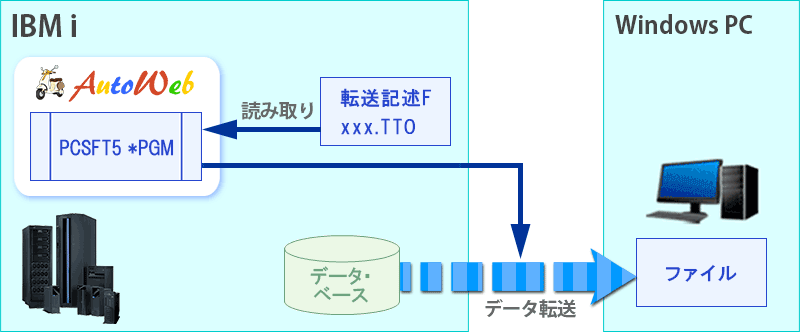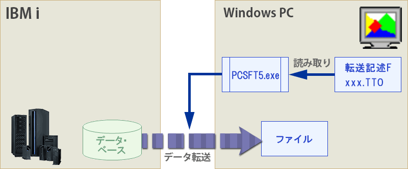 IBM i 上のPCSFT.PGM がデータ転送を行います。
