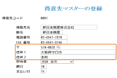 郵便番号に値を入力すると住所1 と住所2 が検索されて表示されるようになります。