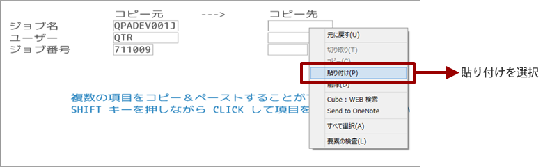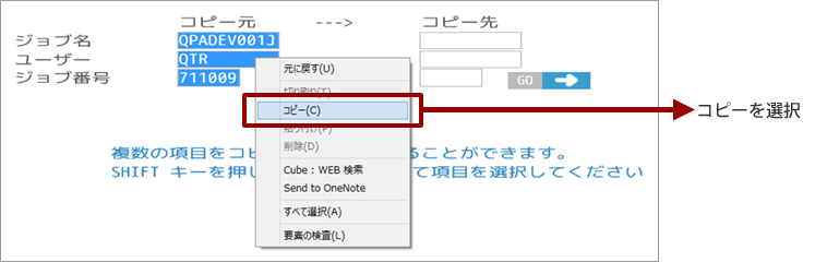 Shiftキー を押しながらコピー元のジョブ名、ユーザー、ジョブ番号を選択して